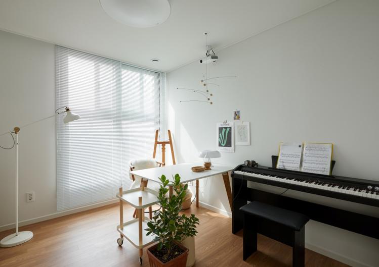 현관 복도 중 첫 번째 방인 서재 공간입니다. 요사이 취미로 시작한 피아노를 저렴한 가격에 구매하여 배치하였고, 몇 가지 인테리어 소품들과 책상을 두었습니다.