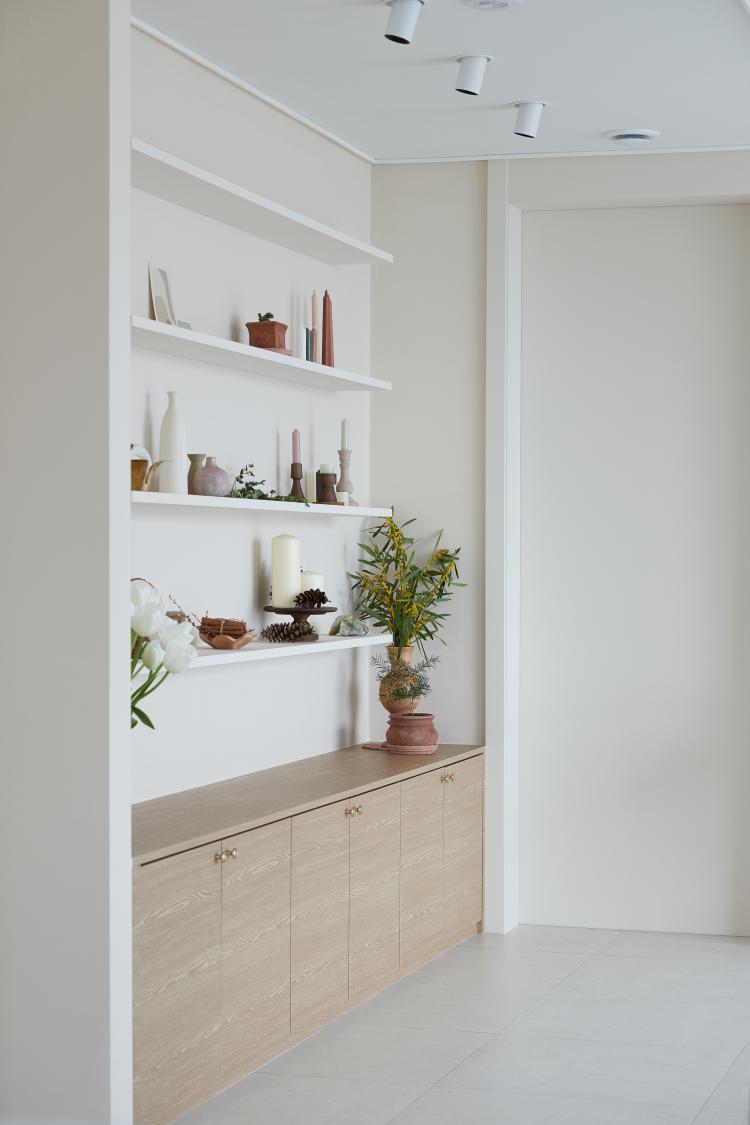 천장에는 해당 선반에 포인트를 출 수 있도록 핀 조명을 달았고, 혹시 부족할 수 있는 수납공간 때문에 무릎 높이 정도의 선반을 부엌 공간과 통일된 나뭇결 필름으로 마무리하였습니다.
