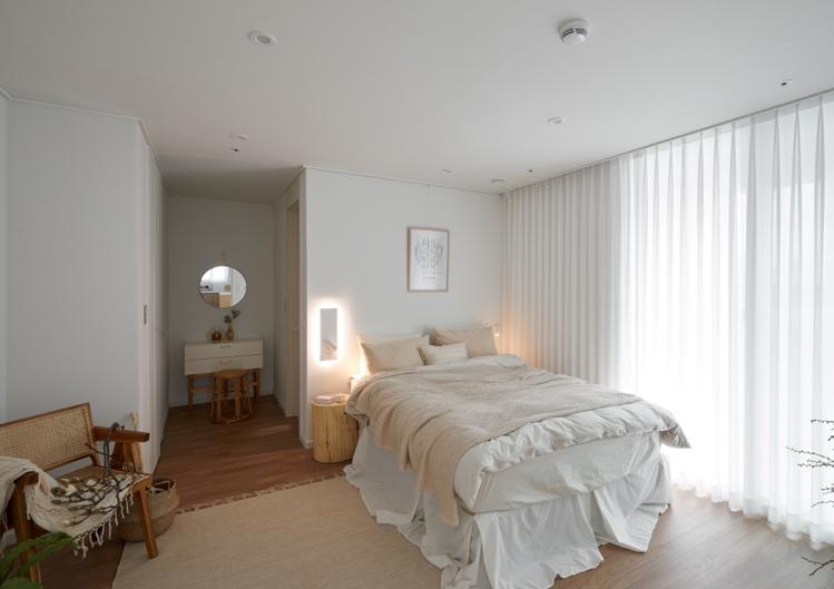 안방 모습입니다. 거실의 톤과 비슷하게 하얀 차르르 커튼과 베이지색 침구, 적당한 인테리어 소품들을 배치하였고, 독서를 좋아하는 와이프를 위해 침대 양 옆에 독서 등을 매립 시공하였습니다.